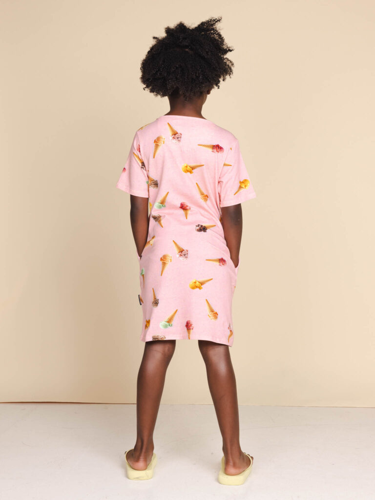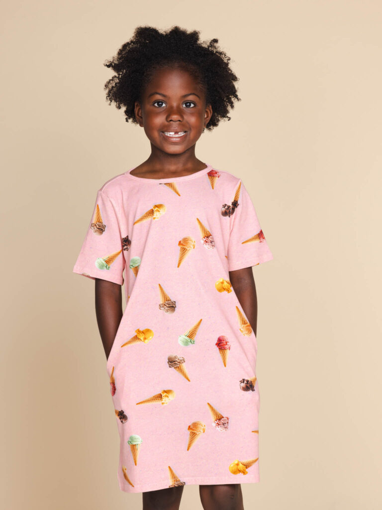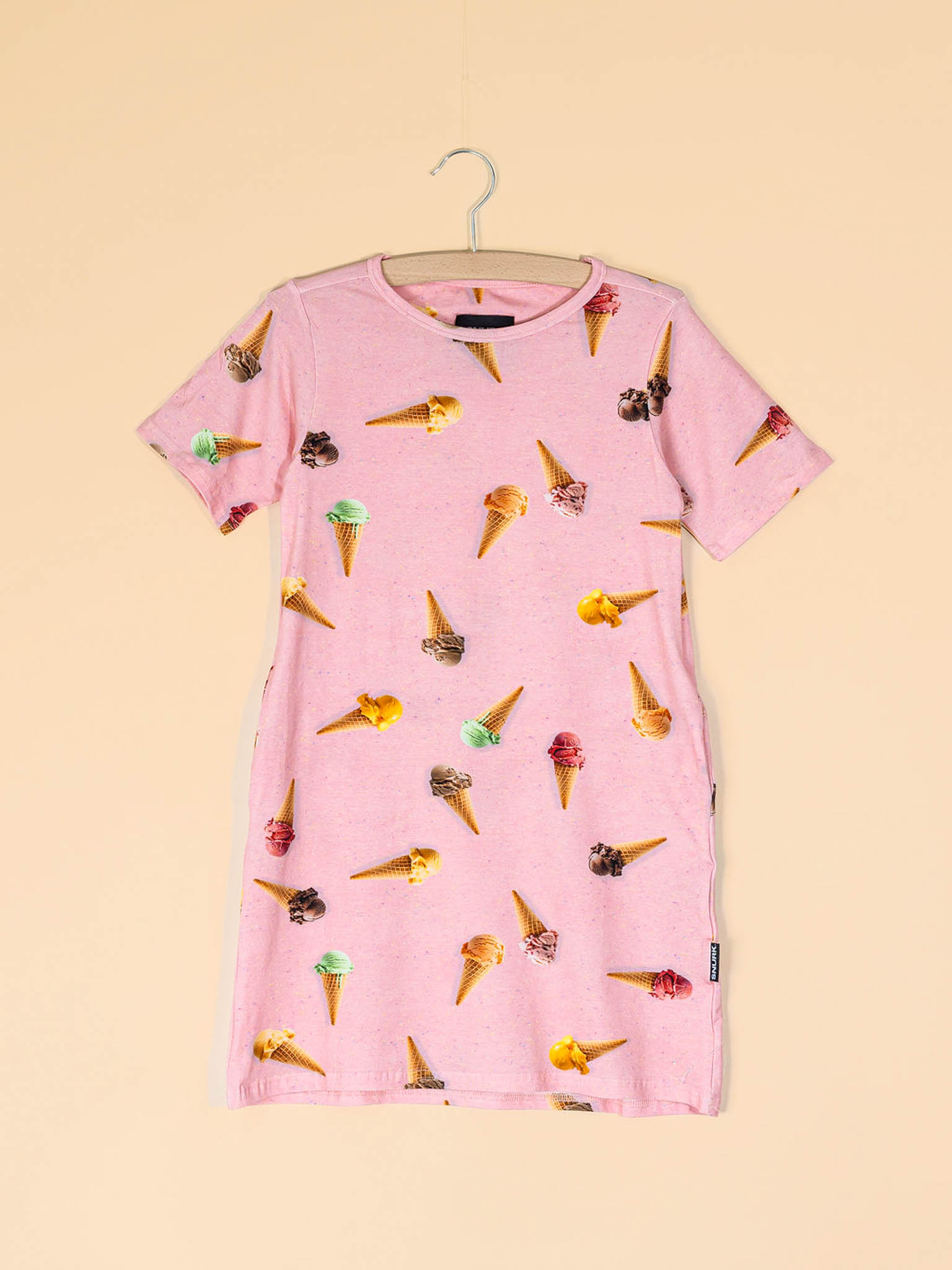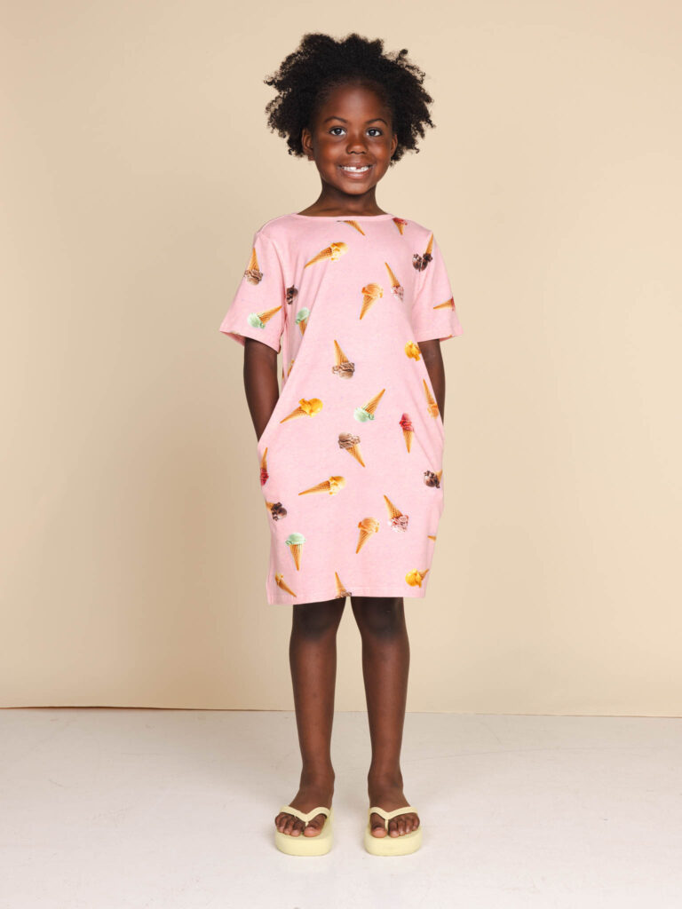Heb jij ook nog plek over voor een ijsje? Maar liefst 5 heerlijke Italiaanse bollen ijs stapelden we op een hoorntje op je shirt. Op ware grootte, zo kan je ‘m al bijna vasthouden en proeven! Voor de broeken en jurkjes kozen we voor een vrolijke rondvliegend ijshoorntjes patroon op een warme roze achtergrond. Smelt jij ook?