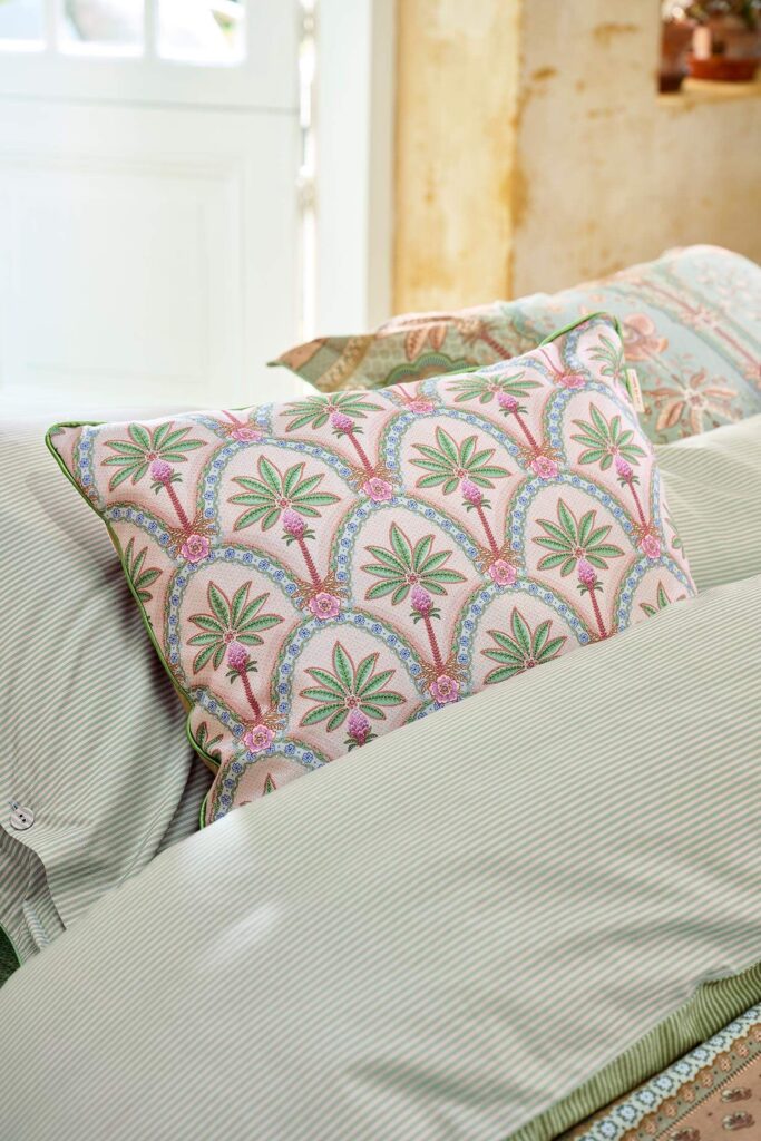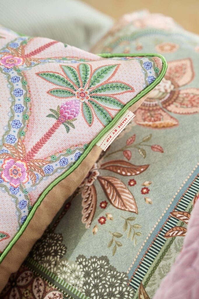 Het Sierkussen Indian Summer bestaat uit sierlijke bogen met een bloemenmotief en elegante palmbomen, geïnspireerd op de Indiase bouwstijl. Het kussen heeft een canvas-achtige structuur, die het een luxe uitstraling geeft. De randen zijn afgewerkt met een groene bies en de sloop heeft een blinde rits aan de onderkant.