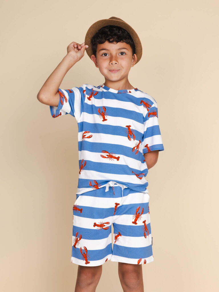 Voel de zon, ruik de zee. In deze blauw gestreepte outfit met rode kreeften stap je zo de Franse boulevard op. Je bent hiermee altijd comfortabel, luchtig en in vakantiestemming. Gemaakt van zacht en luchtig biologisch katoen.