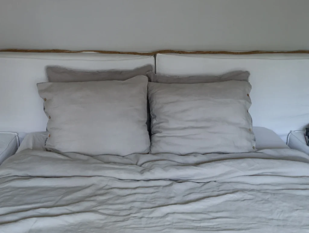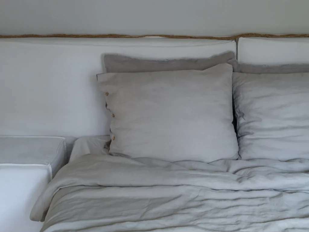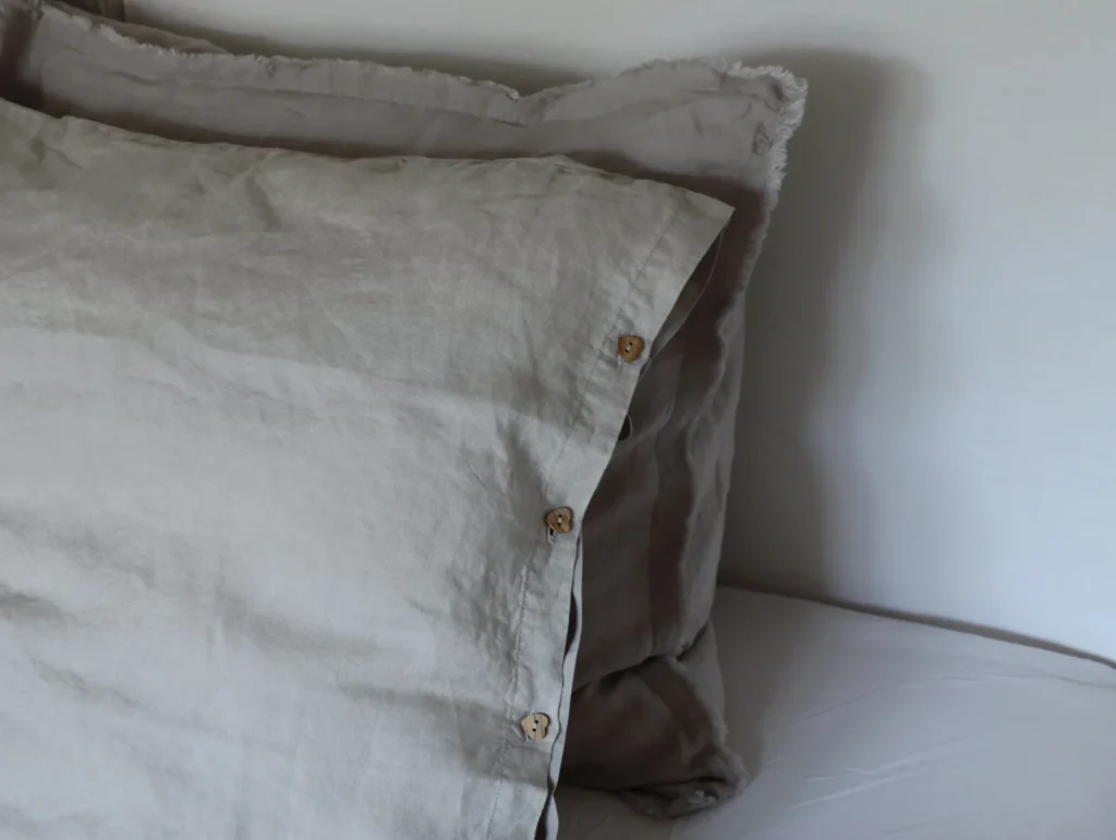 De bovenkant is gemaakt van 100% linnen (165 gsm), de onderkant van een bijpassende kleur katoen percale – een perfecte mix van textuur en comfort. Uniek aan Loekie is de knoopsluiting: de kussensloop is afgewerkt met houten knopen in hartvorm.
