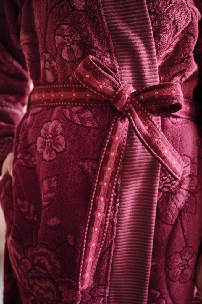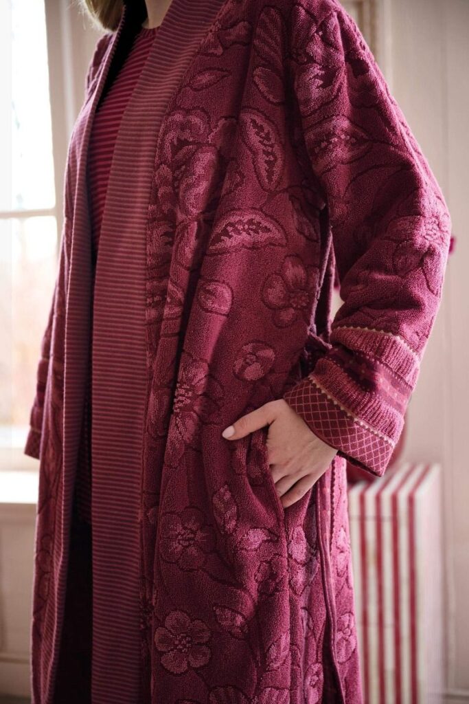 De stijlvolle badjas Jasmin Jacquard van Pip Studio voelt heerlijk zacht aan en luxe aan. Het tonaal bloemendessin met subtiel hoog-laag effect in de bloemen geeft deze badjas een extra rijke uitstraling. De mouwen hebben een brede jacquard sierrand van gestileerde bloemen en streepjes. De tailleband is rijk versierd met een ingeweven bloemenmotief. Combineer de badjas met de overige badstofcollecties van Pip Studio voor het ultieme mix&match-effect.