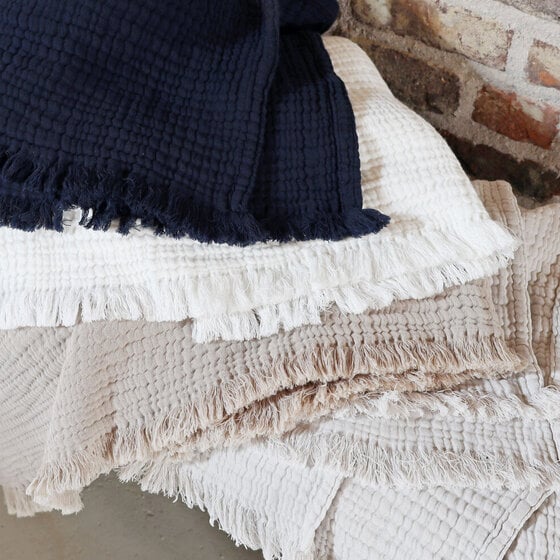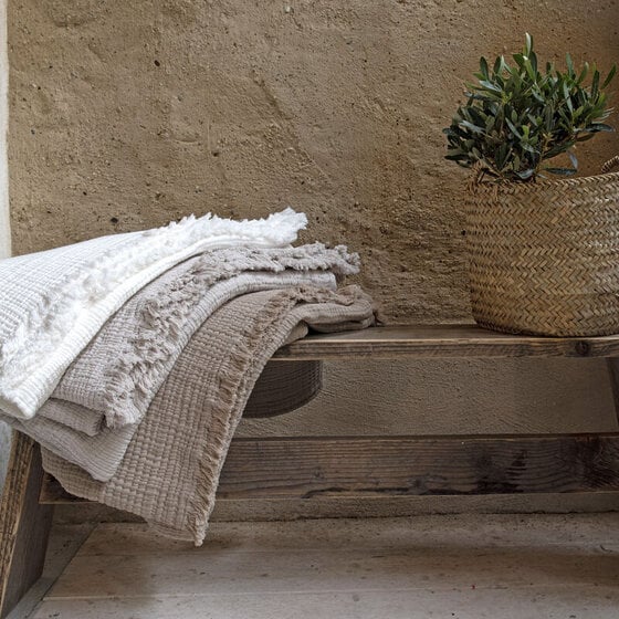 Dit prachtige plaid Puglia is gemaakt van 100% katoen. Je herkent het aan de kenmerkende wafelstructuur met fringes. Super comfy! Kleur is Naturel dus overal te combineren.