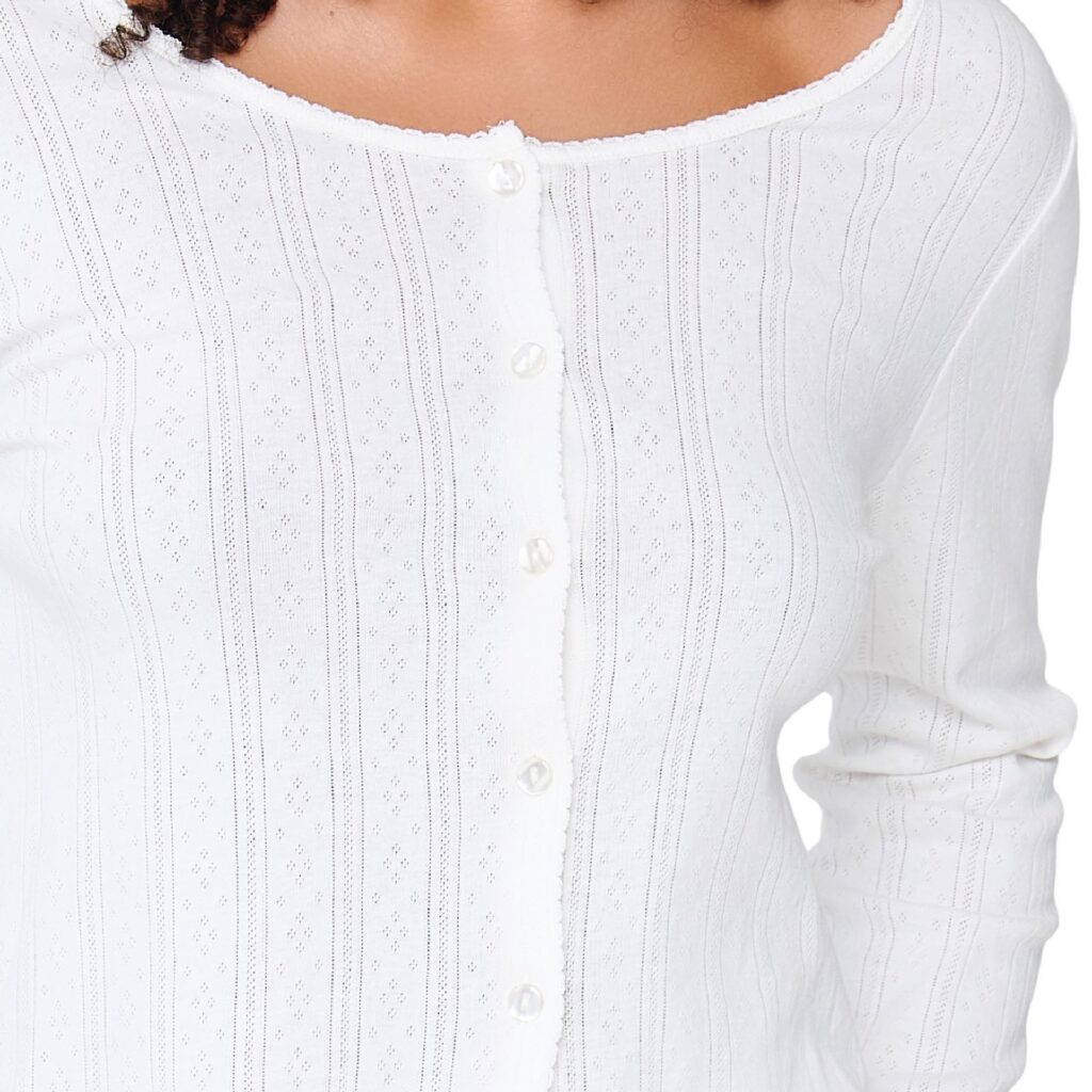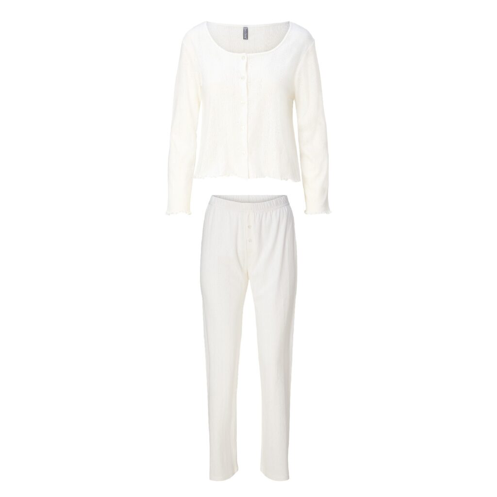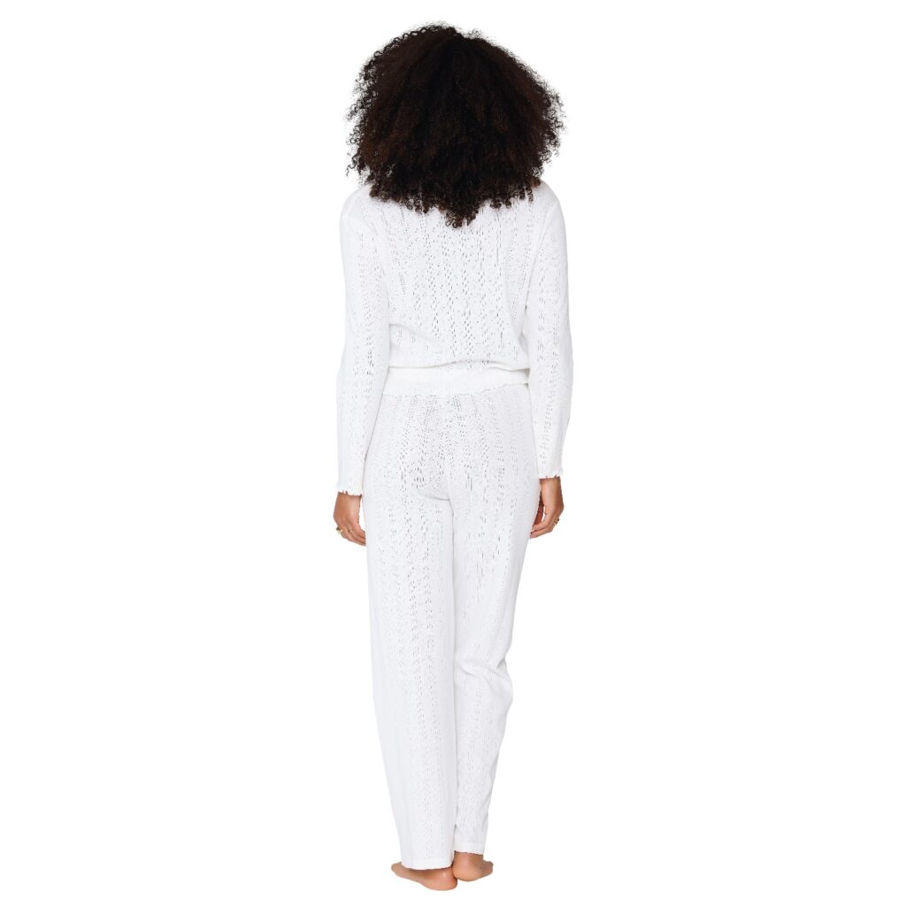 Cotton Comfy! Deze mooie, katoenen set bestaat uit een vest met knoopjes en een lange, rechte broek. De pointelle structuur in de stof geeft een romantische touch aan de set. Door de katoenen kwaliteit voelt de set soepel en ademend aan.