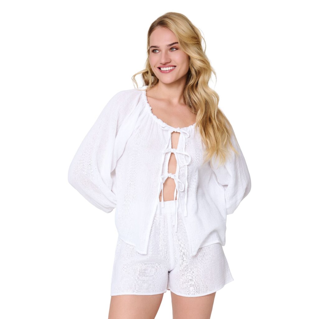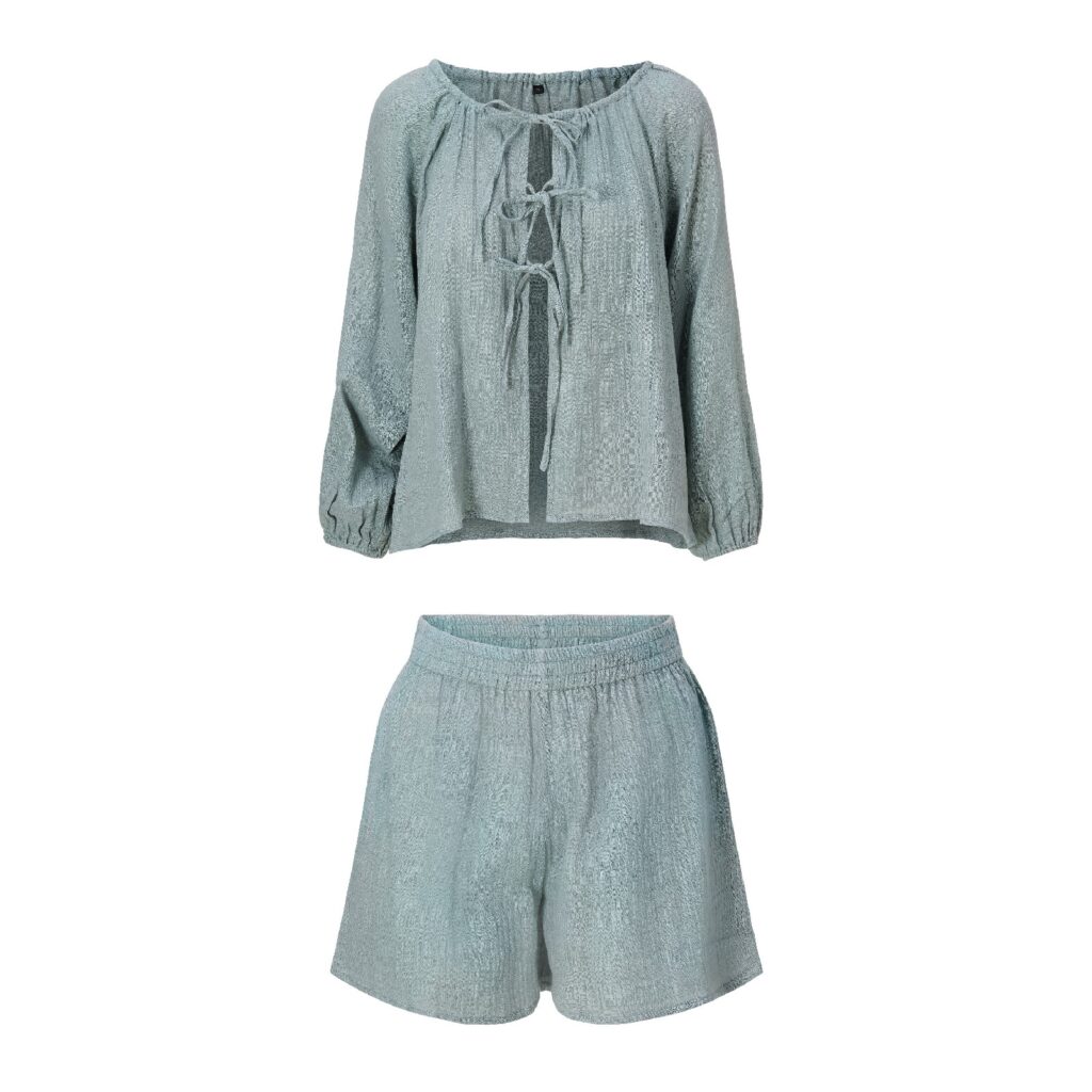 Ibiza vibes! Deze prachtige, katoenen set is een echte eyecatcher. De luchtige set bestaat uit een lange top met strikjes aan de voorkant. De bijbehorende shorts heeft een losse fit en een elastieken boord voor een comfortabele fit.