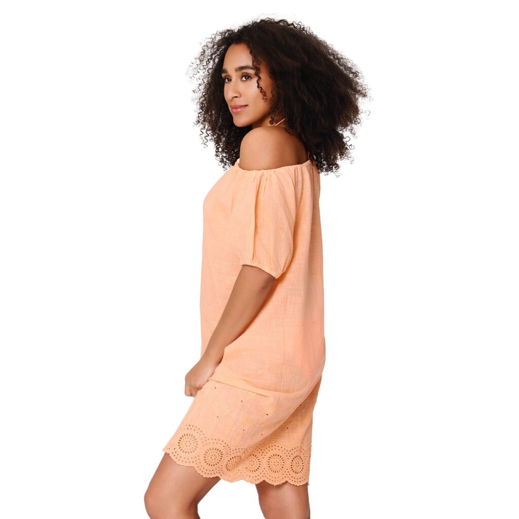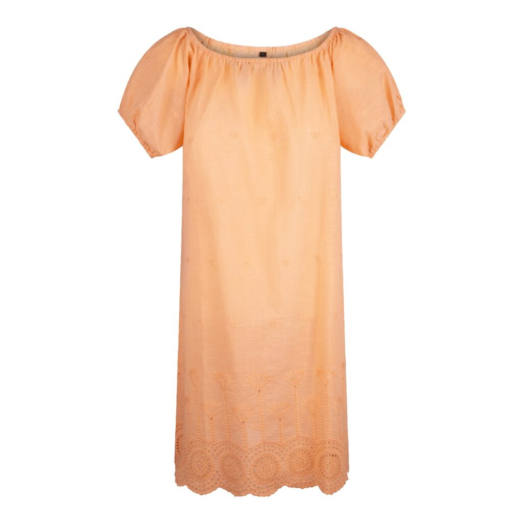 Cotton Comfy, Deze luchtige, jurk is perfect om over je bikini of badpak te dragen. Door de katoenen kwaliteit voelt de jurk erg comfortabel aan. De wijde hals en pofmouwtjes geven de jurk een vrouwelijke touch. In de stof zit een subtiel boorduurwerk.