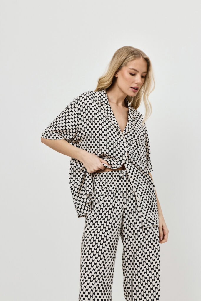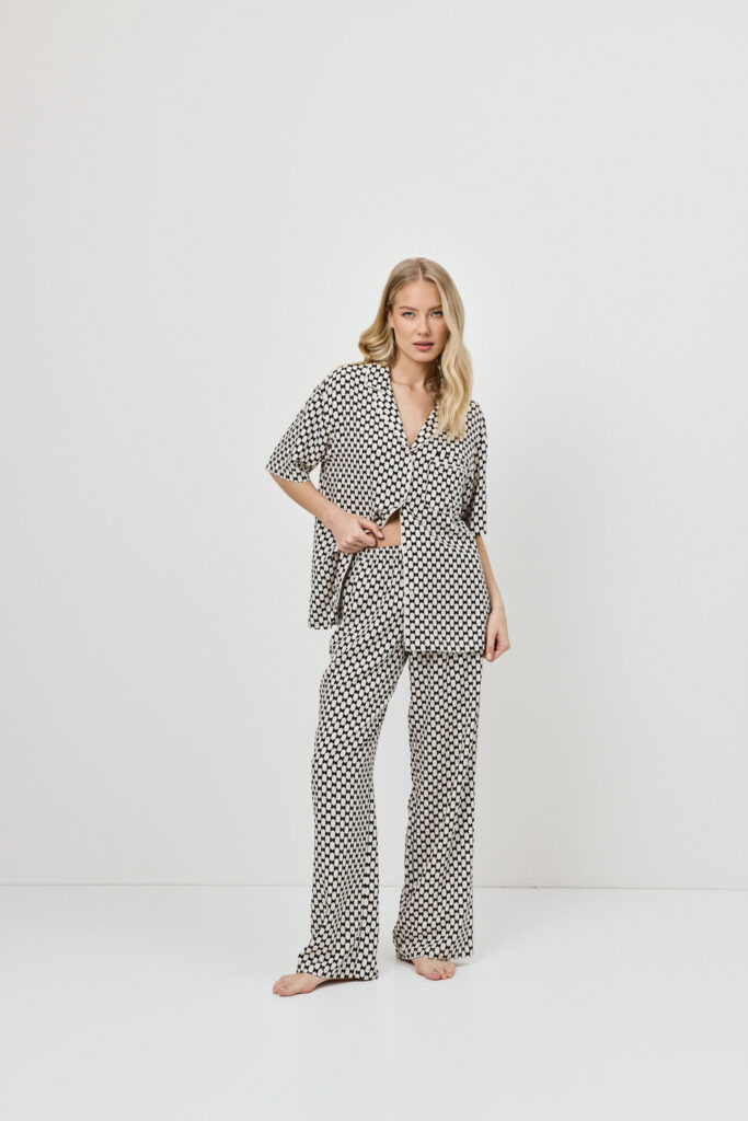 Prachtige Pyjama set. Met als ondergrond een mooie ivory met zwart motief erin verwerkt.